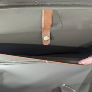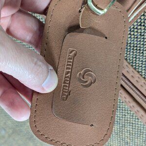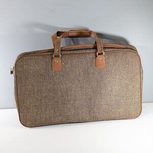 A Samsonite Special Collection soft-sided suitcase in a brown / tan tweed-like material and faux leather details made in Korea. Zips open just like a suitcase and has tie-down straps on the inside to hold your items in place. With a 1 clip pocket on the inside and a zippered pocket on the outside of the case. The slightly longer carry straps are just about long enough to carry the bag over your shoulder (not if you are very muscular or if the case is very full). It does not have a shoulder band (not part of the design) With the original little lock and keys, and luggage tag. The bag is in good shape. Dates ca 1980s