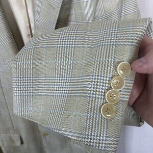 Men’s blazer. Samuelsohn tailored for O’Connors Calgary. Premium Scabal cloth, silk & wool blend. Light tan/cream plaid, gold buttons, fully lined. Fits as a 42XL (long sleeves).