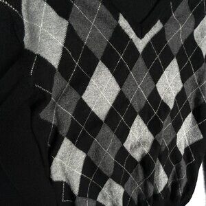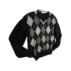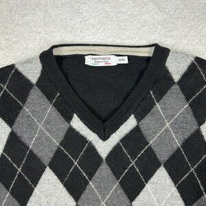 San Marco Sweater Mens M 100% Merino Wool Italy Black Grey Argyle V Neck Jumper