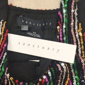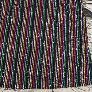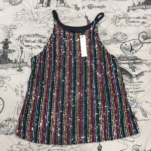 Make any look instantly party ready with this sparkling tank covered in rainbow stripes of sequins and cut away to show off glowing shoulders.