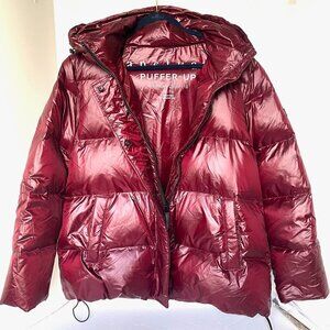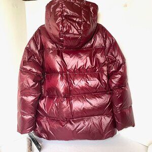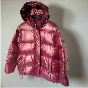 Sanctuary Hooded Premium Down Puffer Coat Womens XL Red Short Zip Shiny Nylon