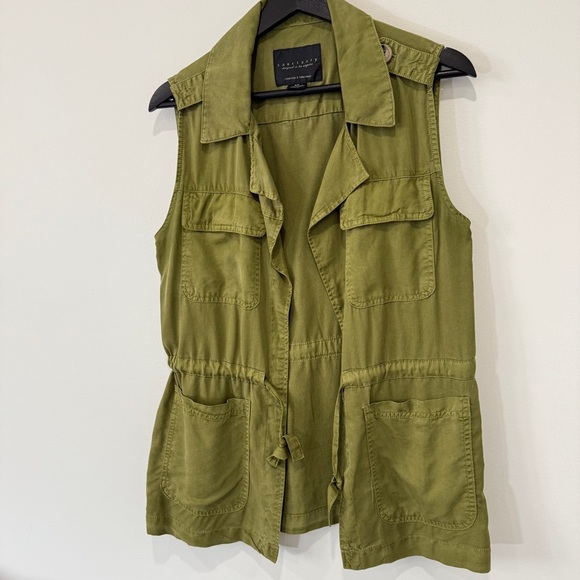 Chic olive green vest by Sanctuary. Features multiple pockets and a tie waist. Ideal for layering.