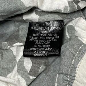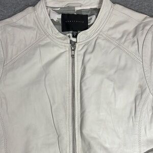 Sanctuary oyster white colored bomber style jacket. Size small with elastic waistband and cuffs, front zip and 2 pockets, and an arm zipper pocket. 1 small mark on front left side of jacket, see last 2 photos, no other flaws or marks, beautiful soft 100% leather. Measurements are pit to pit 18.5 inches and length is 21 inches.
