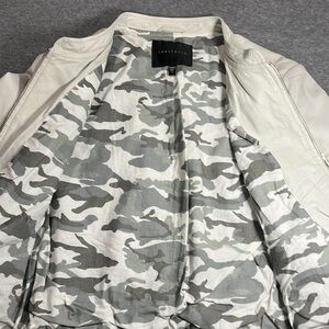 Sanctuary oyster white colored bomber style jacket. Size small with elastic waistband and cuffs, front zip and 2 pockets, and an arm zipper pocket. 1 small mark on front left side of jacket, see last 2 photos, no other flaws or marks, beautiful soft 100% leather. Measurements are pit to pit 18.5 inches and length is 21 inches.