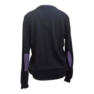 Elegant black V-neck sweater perfect for any occasion with cute purple elbow pads. 100% merino wool. Soft and comfortable fabric for all-day wear. Length 26" Bust 38" Sleeves 23"