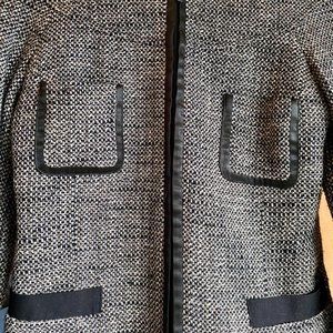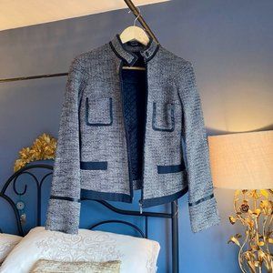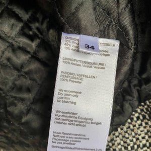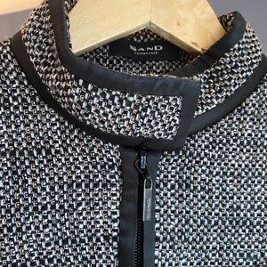 Black, brown, and cream boucle tweed moto blazer by Sand Copenhagen, size EU 34 = XS or US 4. Black trim, zipper front. Excellent used condition.