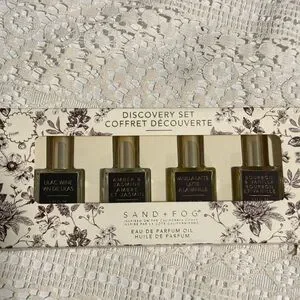 Sand + Fog discovery set with four parfum oils. Includes Lilac Wine, Amber & Jasmine, Vanilla Latte, and Bourbon Vanilla. Perfect for fragrance lovers.