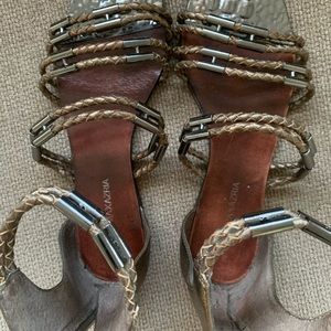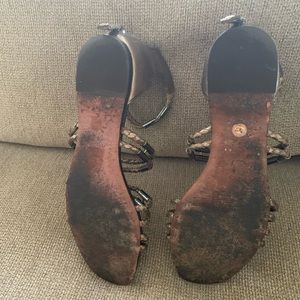 These metallic sandals have cork soles, so they appear to be more used then they are. I love them but sadly they are to big for me. The lucky purchaser will enjoy them for their comfort and they go with so many outfits!