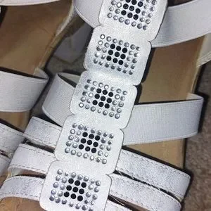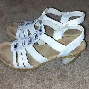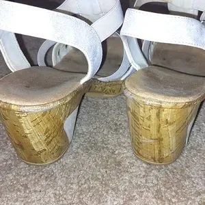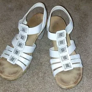 Gently used sandals. These sandals are comfortable. The have elastic straps in some areas, so that helps with the comfort. Low heel makes these sandals easy to walk in.