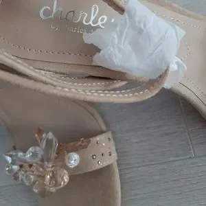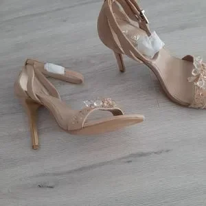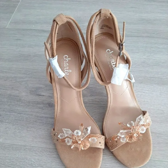 new, crystals and plastic jewelries, suede tan, 4" heels