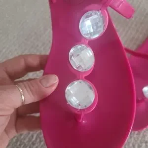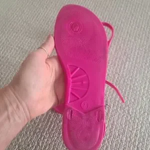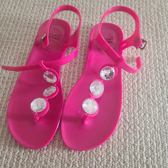 STUART WEITZMAN GIRLS PINK JELLY SANDALS WITH GEM DETAILING.