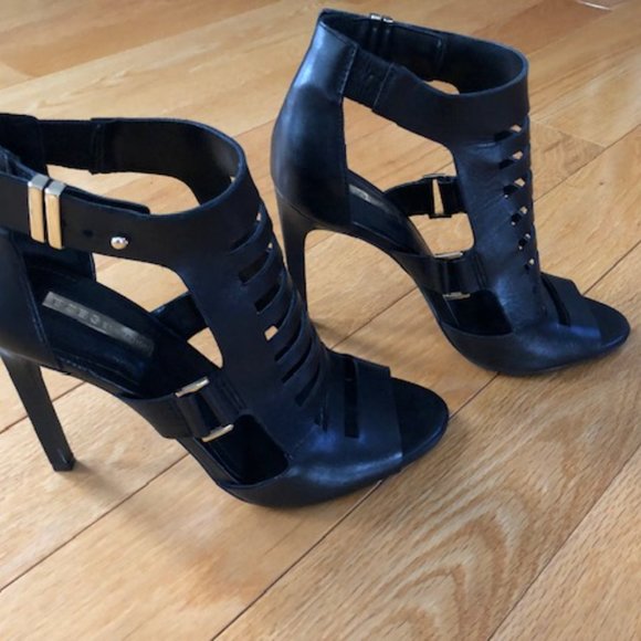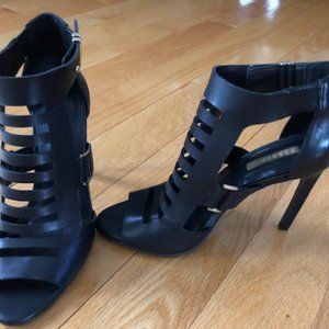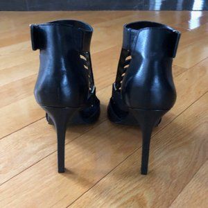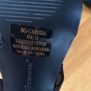 By BCBGeneration. Real Black Leather. Only worn once...excellent condition. Gold Tone accents. Heel height is 4 inches.