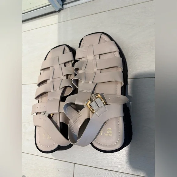 Stylish beige strappy sandals featuring a gold buckle. Perfect for casual outings.