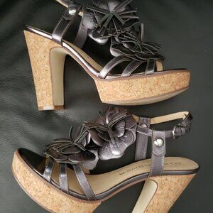 Marc Fisher, floral cork platform heels. Adjustable ankle straps. Metallic dark gray color. With two large flowers, and high (approx 4.5") cork heels