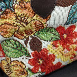 Sander Bags & More Vtg Red Floral Tapestry Tote Bag/Purse Brown Leather Handles