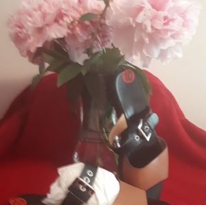 Slip on sandle. Made in Italy. Black and Tan leather straps. Open toe.1-1/2" heel