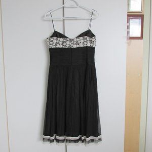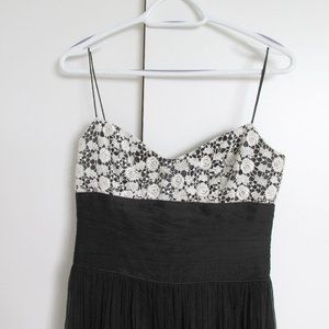 Beautiful Sandra Angelozzi flowy black silk chiffon dress with white flower lace bodice and white striped hem.