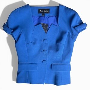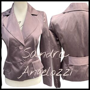 Beautifully tailored Sandra Angelozzi blazer in a black Polyester stretch blend. Grosgrain ribbon waist ribbon tie. Light shoulder pads. Fully lined.