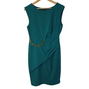 Sandra Darren Green Short Sleeved Dress with Gold Detail and Ruching