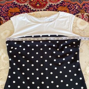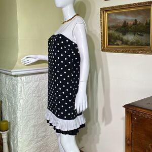 In excellent preowned condition lovely Sandra Darren sleeveless mini dress. Black with white polka dots, two layers of pleats and clean white neckline.