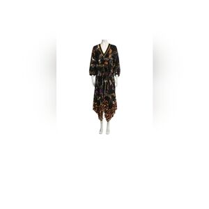 Sandro long sleeve black pleated western dress. V-Neckline and colours of gold, blue brown and black. Decorated head to toe with various cowboy boots, roses, and gold chains. Asymmetrical hemline, minimal but some stretch in waistline.