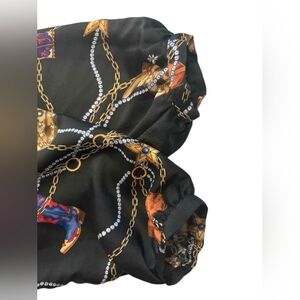 Sandro long sleeve black pleated western dress. V-Neckline and colours of gold, blue brown and black. Decorated head to toe with various cowboy boots, roses, and gold chains. Asymmetrical hemline, minimal but some stretch in waistline.