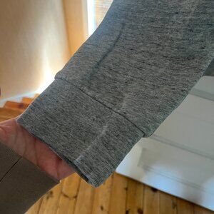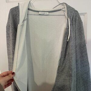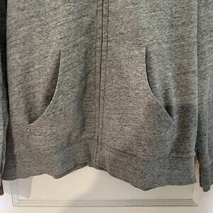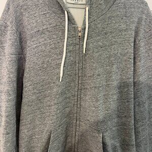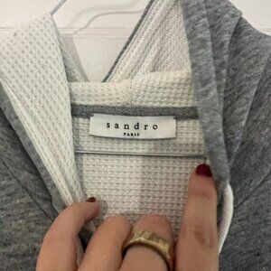 Stylish gray zip-up sweater by Sandro. Features a hood and front pockets. Perfect for casual wear.