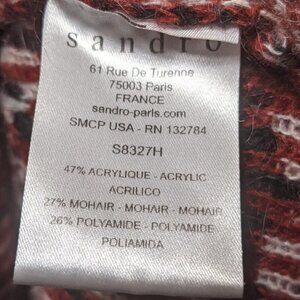 Beautiful fluffy mohair blend sweater with black ribbed trim and red/white print.