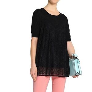 Beautiful linen blend short sleeve blouse with pleated lace overlay. There is a tiny hole above the content tag on the inside lining. Needs a couple of stitching only (see last photo). Does not affect the appearance of the blouse.