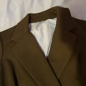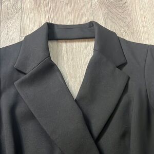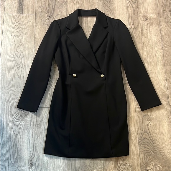This sophisticated black dress features a double-breasted design, perfect for any formal occasion. Its sleek silhouette offers a timeless look.
