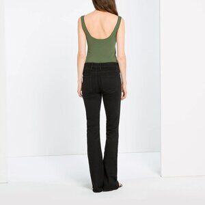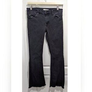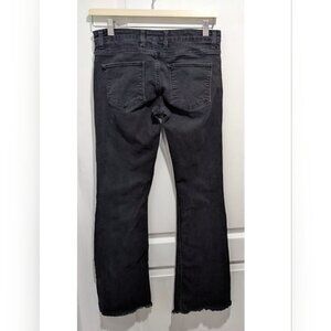 Zip fly with button closure, five-pocket silhouette, mid rise Tonal stitching, black logo hardware, belt loops Flared silhouette, fringed hem