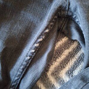 Fastening: Zip and button closure. Condition: Used, some fraying on the inseam
