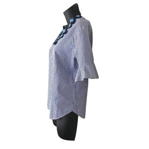 Sandro Paris Blue & White Striped Cotton Blouse With Lace Neck Line Size M