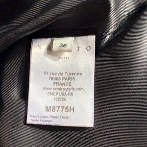 Women's navy blue / charcoal gray colorblocked wool blend coat from Parisian label Sandro. Black leather at sewn down collar and pocket welts. Beautiful lines, minimalist tailoring. Hidden single button closure. Not worn much, no pilling or stretching. There are some thread bare spots as shown in last photos.
