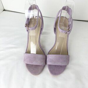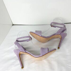 Sandro Paris Nina Lavender Suede Heeled Ankle Strap Sandals. High heel with thin ankle strap. Appear to have been tried on in store, but never worn. Protective cover still on bottom. Small marks on protective cover from being tried on. Small marks on toes of footbeds. Sticker residue on backs of footbeds. Slight twist on buckle of left shoe. Does not affect ability to buckle shoe. (see photos). No other known flaws.