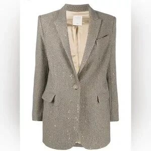 -It is a single-breasted blazer featuring a herringbone pattern embellished with subtle, tone-on-tone sequins