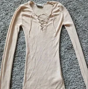 Ribbed long sleeve v-neck with a lace up front. It is made of a very lightweight material as well.