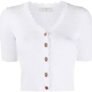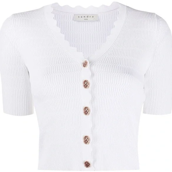Chic white knit top by Sandro. Features scalloped edges and elegant buttons. Perfect for versatile styling.