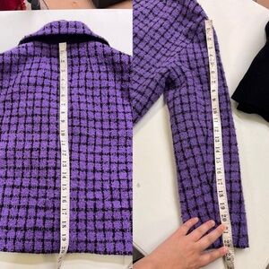 Elevate your wardrobe with this striking Sandro Paris Simona Blazer in a bold purple and black plaid tweed.