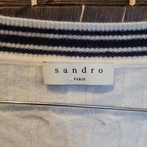 Elegant white V-neck sweater with black trim. Features a chic waist tie. Perfect for a refined style. Beautiful blend of wool and cashmere, ptp is 18 1/2"