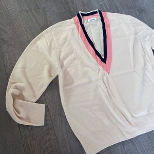 SANDRO's beige Viken jumper is constructed from soft wool-cashmere blend fabric and decorated with contrasting stripe detailing along the deep V-neck.