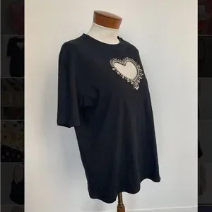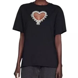 Round-neck, short-sleeved T-shirt featuring a cutaway heart on the chest embellished with multicolored rhinestones.