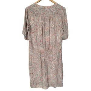 DESCRIPTION: A simple comfy wear anywhere dress. Perfect for sea side strolls! Lightweight material will a lining. V neck with metal ball buttons. Short sleeves with a turned and tabbed cuff. Taupe base with a blue & orange abstract floral print. Cinched at the back waist. Has light belt loops that could be removed or add your own belted touch.