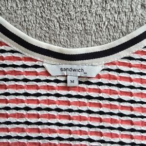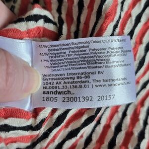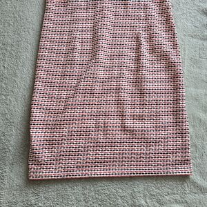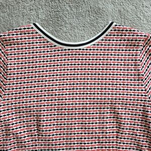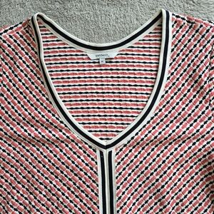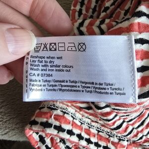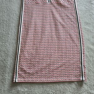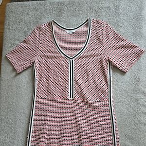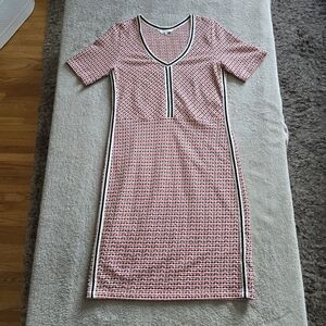 Knee length slip on short sleeve dress with v-neck. In very good used condition. Orange, black and white pattern with accent stripes