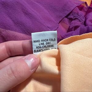This Sangria petite 100% silk dress is a vibrant, feminine piece in excellent pre-owned condition with minimal signs of wear. It features fixed straps, a side zip, full lining, and lightly padded cups for extra structure (pads are not removable). The colorful silk fabrication creates a soft, flowy look — perfect for weddings, parties, vacation dinners, or summer events.