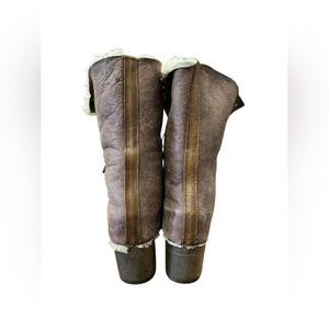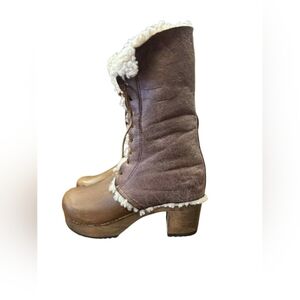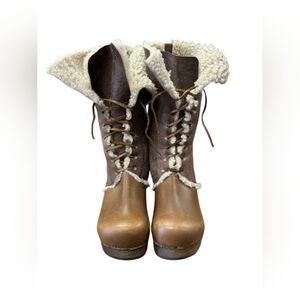 Sanita Clogs Block Boots Leather Wood Real Fur Lamb Brown/White Size 41 EUC
