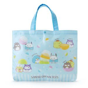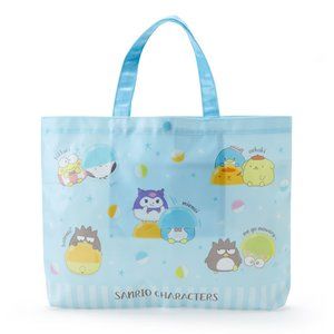 Authentic Sanrio laminated cotton tote bag with several chubby characters and gachapon capsules depicted on a pastel blue background. The back has a different image than the front. The fabric is shiny and water resistant. Has a metal button closure and 1 inner pocket. Imported from Japan.