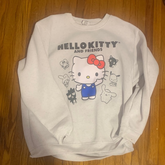 Cozy white sweater featuring Hello Kitty and friends. Crew neck design. Perfect for casual wear.