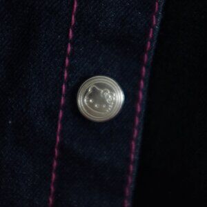 This is a Hello Kitty denim dress for a young girl. Key features include: Dark blue denim fabric Short cap sleeves Button-up front Hello Kitty logo embroidered on the chest Hello Kitty character embroidery with hearts design Pink fabric belt with Hello Kitty pattern Gathered/ruffled skirt portion Excellent used condition Listed under various sizes only one 6x is available Make an offer