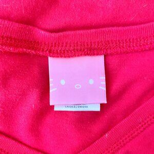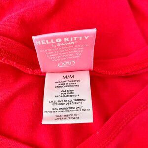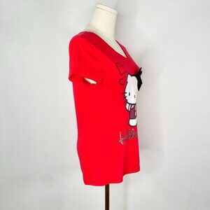 ⋆ A vibrant red Hello Kitty graphic t-shirt from Sanrio, featuring Hello Kitty waving cheerfully with a 3D ribbon bow and hearts scattered around her. The words "Hello Kitty" are written in shiny metallic black. The shirt is designed with a flattering V-neckline.